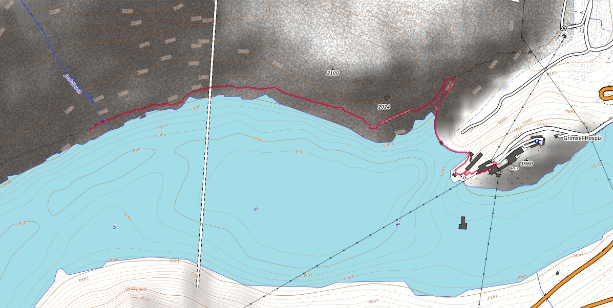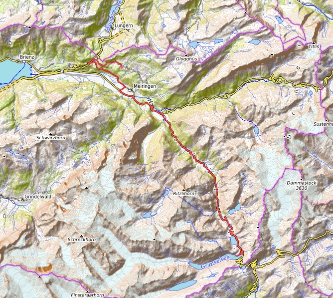 Länge der Anfahrt mit dem PKW einfach 41,8 km. Der Weg fährt vom Hotel Bellevue Hohfluh Hasliberg über Meiringen, Innertkirchen, Guttannen, Räterichsbodensee zum Grimsel Hospiz am Grimselsee. Beim Hospiz (über den Staudamm fahrend) gibt es gute Parkpältze. Von da laüft man dann zu Fuss weiter über die rechte Staumauer, auf einem gut befestigten Weg durch einen Fussgängertunnel weiter in Richtung Lauteraarhütte, die aber nur für alpine Sportler erreichbar ist. Wir als Touristen finden es reizvoll genug bis zu dem ersten Wasserfall, dem Juchlibach in 2 km Entfernung zum Hospiz zu wandern und dann wieder umzukehren. Im Grimsel Hospiz kann man dann danach noch gut einkehren.