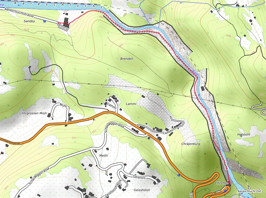 Man fährt mit dem PKW (Weg-Länge 14,7 km) von unserem Hotel Bellevue Hohfluh Hasliberg über den Brünigpass, Meiringen zur Aareschlucht West. Dort gibt es ein großes Areal zum Parken. Besonders an Feiertagen ist dieser Parkplatz trotz seiner grossen Grösse bis zum letzten Platz belegt. Dies zeigt den grossen touristischen Wert der Aareschlucht.