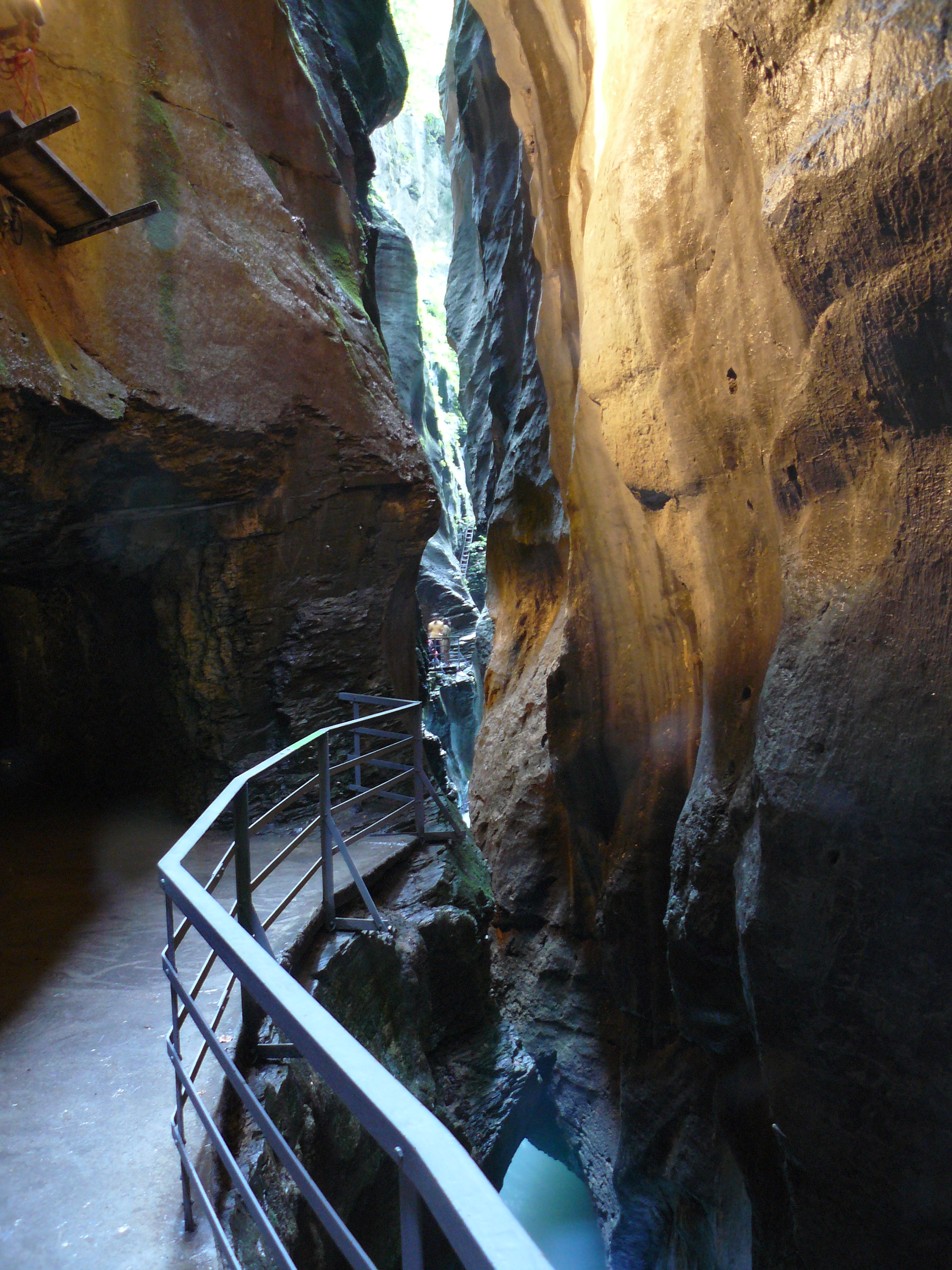 Man spaziert durch die Halle und einem Kartenverkauf hindurch. Für was man sich vorher entscheiden muss, ist, ob man zurück mit der Werksbahn der KWO (Kraftwerke Oberhasli) zurückfährt, oder den gleichen Wanderweg zurückgeht. Der Weg zurück ist auch sehr reizvoll, da man so die Aareschlucht aus einem anderen Blickwinkel anschauen kann. Die Länge der Wanderung beträgt einfach 1,6 km.