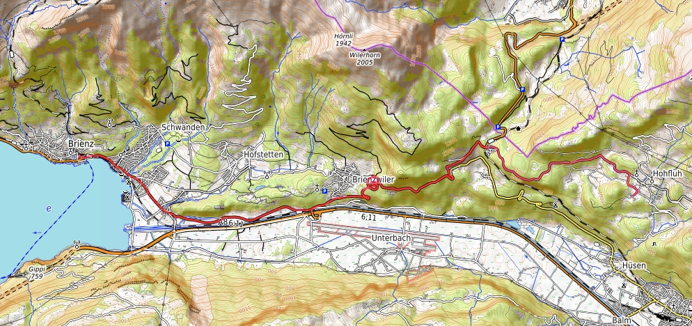 Man fährt von unserem Hotel Bellevue Hohfluh Hasliberg über den Brünigpass direkt nach Brienz und parkt auf dem Parkplatz der Zahnradbahn rechter Hand gleich nach der Bootsanlegestelle. Fahrt-Länge für den PKW beträgt 14,5 km.